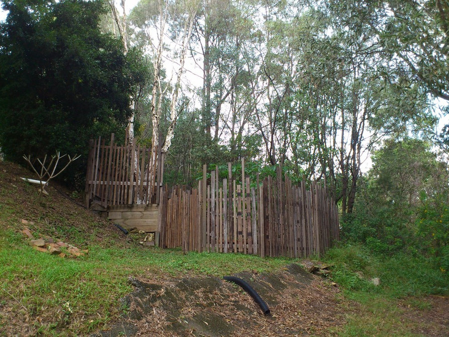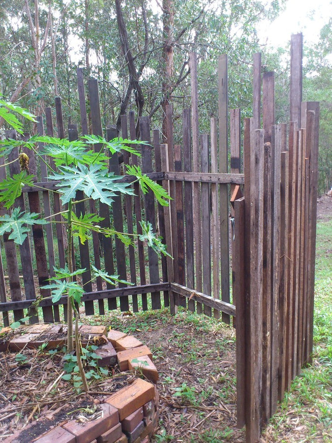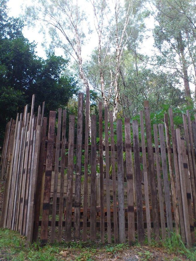 [brief] A garden fence designed to protect the multi-level vegetable garden and also blend into the bush setting. The fence materials were hand picked from a local salvage yard and constructed entirely of re-used hardwood. A randomized height pattern helps the fence blend into its surroundings as will the hardwood as it continues to grey over time. All materials hand picked and salvaged by Culture Botanica Built to Culture Botanica's design + drawings. Constructed by N. Matthews (renter, local landscaper)